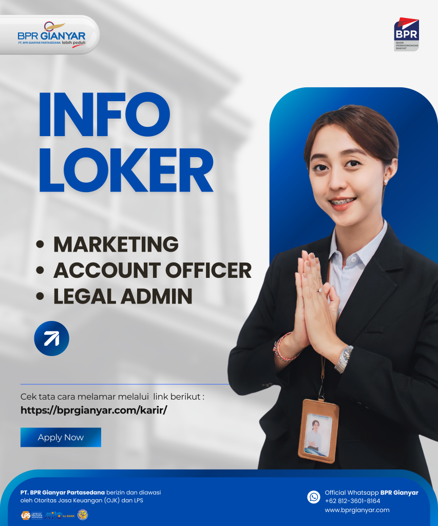 Sebagai salah satu BPR terbaik dan meraih berbagai penghargaan yang dilandasi oleh semangat profesionalisme dan keinginan untuk terus tumbuh dan berkembang. Dalam perjalanan untuk mencapai cita-cita, visi dan misi “Menjadi BPR Terbaik di Bali dengan fokus pada UMKM”, yang hadir di Gianyar, BPR Gianyar Partasedana Bali mengundang profesional muda untuk memiliki karir di industri perbankan sebagai salah satu team terbaik kami.